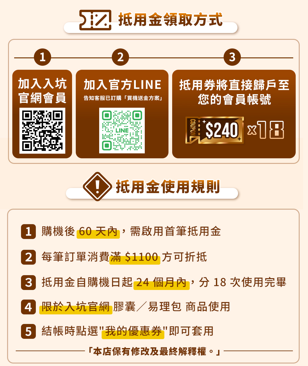 - 抵用金可於每筆滿 $1,100 的膠囊/易理包訂單中使用,結帳時選擇「我的優惠券」即可套用折抵。