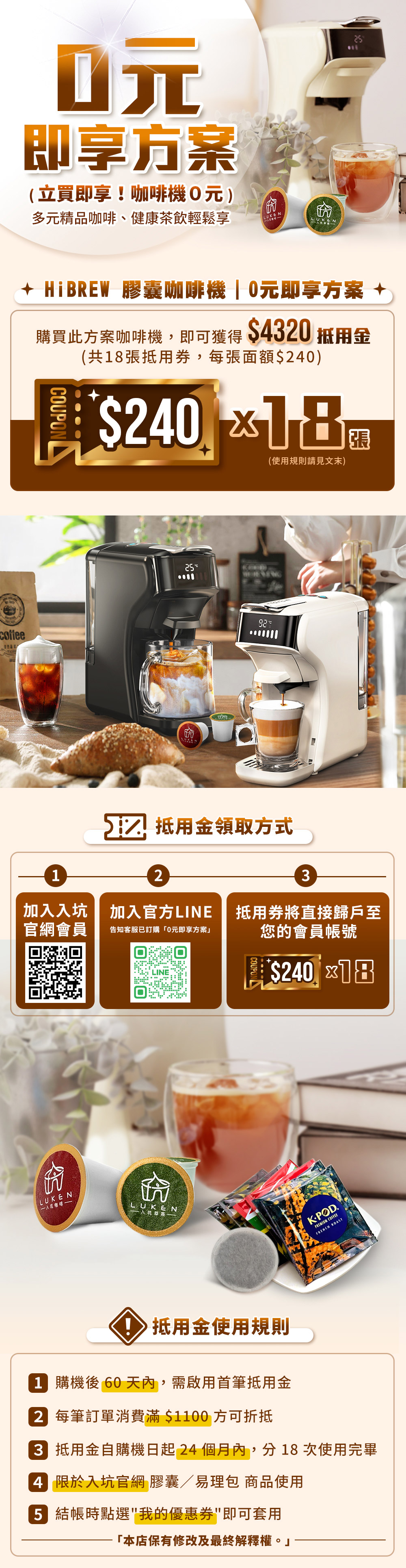 【0元即享方案】恕無法與其他咖啡機促銷或優惠券一起使用。但是,它可以與產品相關的促銷活動結合使用,例如滿額贈、會員紅利優惠,每筆訂單僅可使用一張咖啡抵用金(膠囊/易理包訂單並購買滿$1,100)。