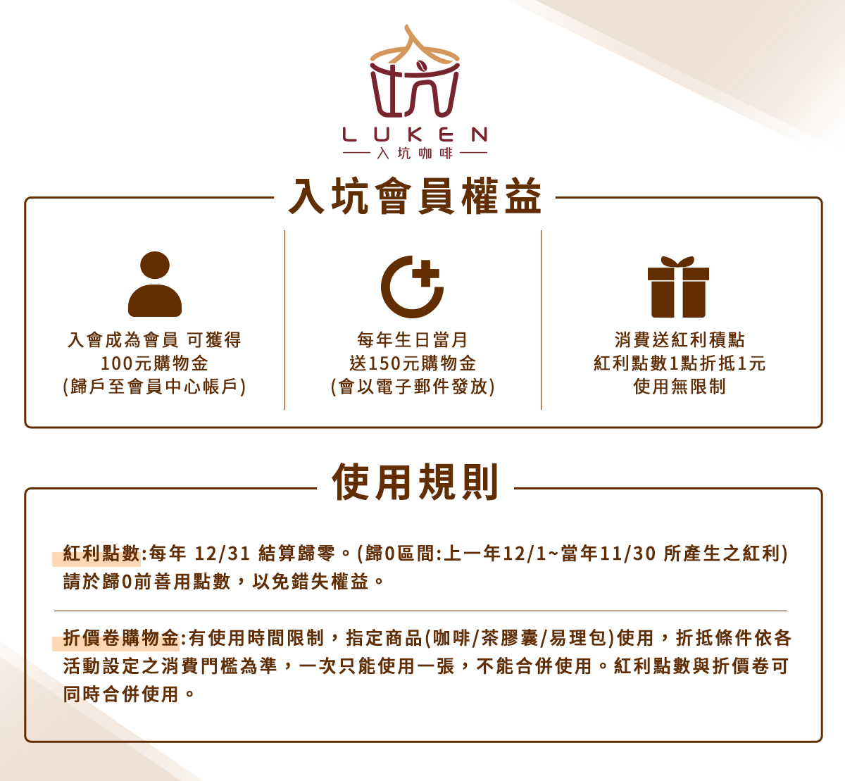 購物金(入會購物金、生日禮金)限 咖啡、茶膠囊/易理包 商品使用。