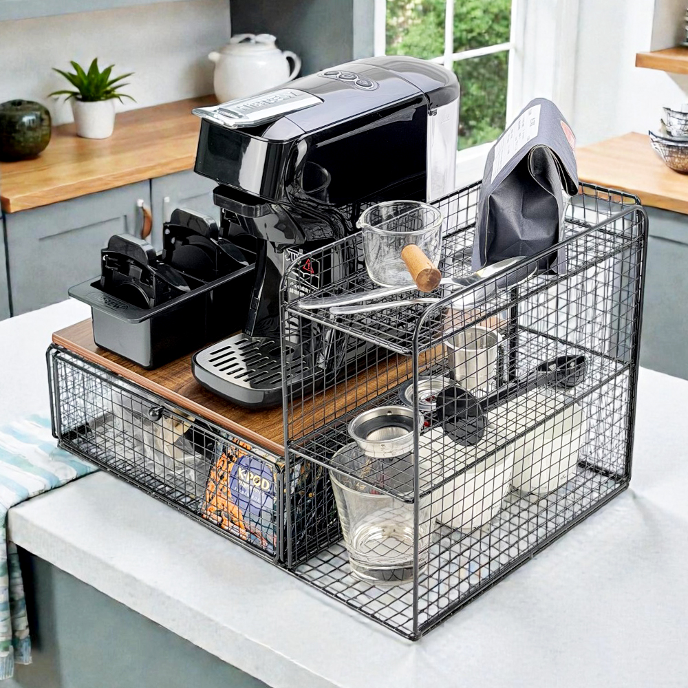 .上下分層設計,上層放咖啡機,下層收納膠囊、杯具與配件